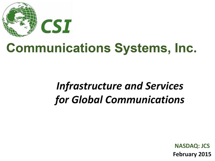 Infrastructure and Services for Global Communications NASDAQ: JCS 1 Communications Systems, Inc. Infrastructure and Services for Global Communications NASDAQ: JCS February 2015