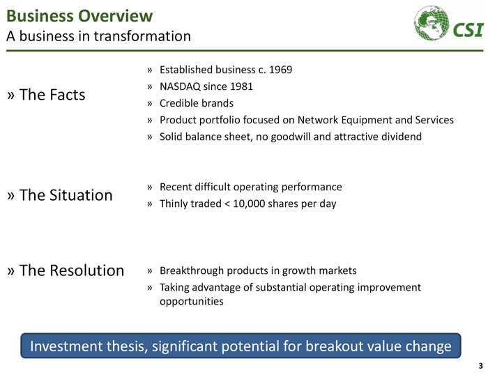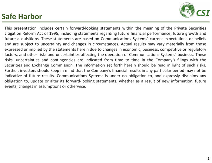 Infrastructure and Services for Global Communications NASDAQ: JCS 2 Safe Harbor This presentation includes certain forward -looking statements within the meaning of the Private Securities Litigation Reform Act of 1995, including statements regarding future financial performance, future growth and future acquisitions. These statements are based on Communication s Systems’current expectations or beliefs and are subject to uncertainty and changes in circumstances. Act ual results may vary materially from those expressed or implied by the statements herein due to changes in economic, business, competitive or regulatory factors, and other risks and uncertainties affecting the operation of Communications Systems’business. These risks, uncertainties and contingencies are indicated from time t o time in the Company ’s filings with the Securities and Exchange Commission. The information set forth he rein should be read in light of such risks. Further, investors should keep in mind that the Company’s financial results in any particular period may not be indicative of future results. Communications Systems is under no obligation to, and expressly disclaims any obligation to, update or alter its forward -looking statements, whether as a result of new information, futu re events, changes in assumptions or otherwise.