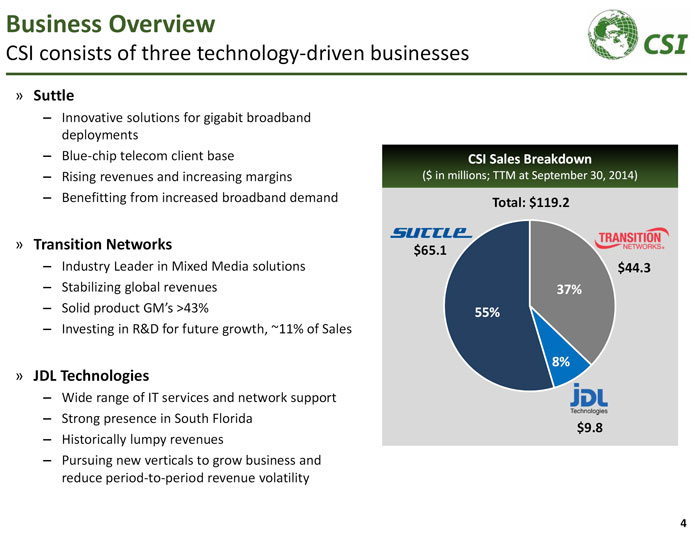 Infrastructure and Services for Global Communications NASDAQ: JCS 3 Business Overview A business in transformation »The Facts »The Situation »The Resolution » Established business c. 1969 » NASDAQ since 1981 » Credible brands » Product portfolio focused on Network Equipment and Services » Solid balance sheet, no goodwill and attractive dividend » Recent difficult operating performance » Thinly traded < 10,000 shares per day » Breakthrough products in growth markets » Taking advantage of substantial operating improvement opportunities Investment thesis, significant potential for breakout value change