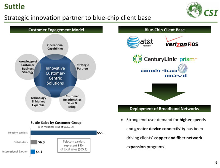 Infrastructure and Services for Global Communications NASDAQ: JCS 5 Suttle Delivering innovative solutions for Gigabit broadband deployments » Solutions for fiber and copper networks meet high-speed demands for application diversity – Brownfield and greenfield – SFU, MDU and MTU » Key brands recently launched -FutureLink™and MediaMAX™ – High-speed connectivity on any medium (fiber, copper, power line, wireless) • OSP and premise applications • Optimized wireless connectivity – Incorporate best available technology, leverage existing infrastructure, and future-proof the network $ in millions Gross margin % Sales Growth and Margin Expansion Quality ManagementSolutions from the Central Office to the Premises Central Office Cabinet Tower MDU Pole Pedestal SFU