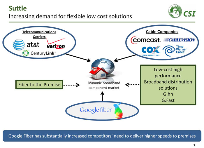 Infrastructure and Services for Global Communications NASDAQ: JCS 6 » Strong end-user demand for higher speeds and greater device connectivityhas been driving clients’copper and fiber network expansion programs. Suttle Strategic innovation partner to blue-chip client base Customer Engagement Model Blue-Chip Client Base Deployment of Broadband Networks Suttle Sales by Customer Group ($ in millions; TTM at 9/30/14) Telecom carriers represent 85% of total sales ($65.1)