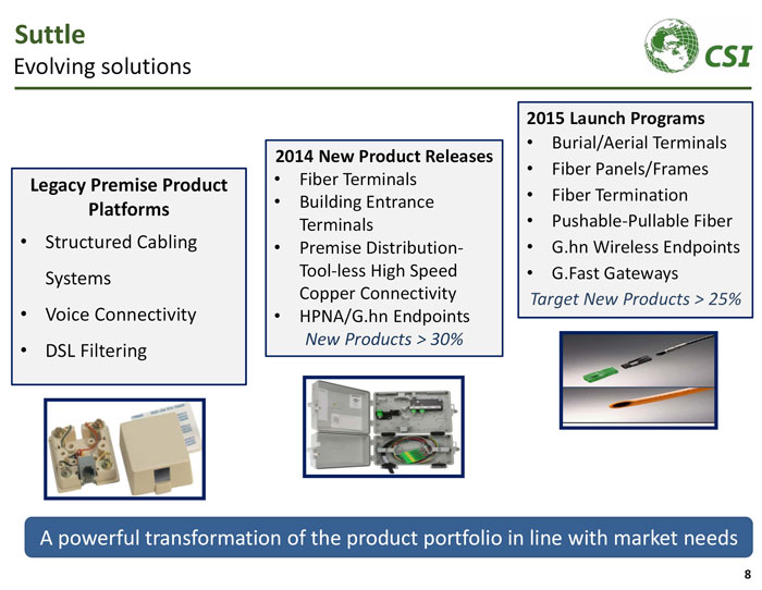 Infrastructure and Services for Global Communications NASDAQ: JCS 7 Suttle Increasing demand for flexible low cost solutions Telecommunications Carriers Cable Companies Fiber to the Premise Low-cost high performance Broadband distribution solutions G.hn G.Fast Google Fiber has substantially increased competitors’need to deliver higher speeds to premises Dynamic broadband component market