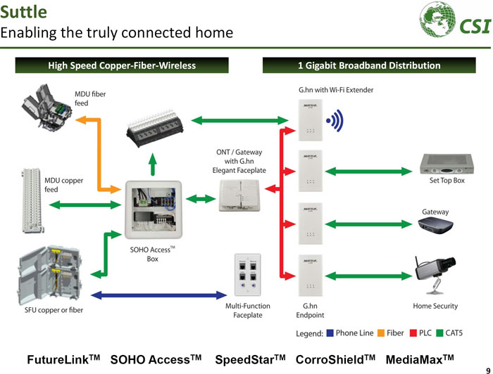 Infrastructure and Services for Global Communications NASDAQ: JCS 8 Suttle Evolving solutions 2015 Launch Programs •Burial/Aerial Terminals •Fiber Panels/Frames •Fiber Termination •Pushable-Pullable Fiber •G.hn Wireless Endpoints •G.Fast Gateways Target New Products > 25% 2014 New Product Releases •Fiber Terminals •Building Entrance Terminals •Premise Distribution-Tool- less High Speed Copper Connectivity •HPNA/G.hn Endpoints New Products > 30% Legacy Premise Product Platforms •Structured Cabling Systems •Voice Connectivity •DSL Filtering A powerful transformation of the product portfolio in line with market needs