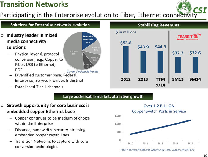 Infrastructure and Services for Global Communications NASDAQ: JCS 9 Suttle Enabling the truly connected home 1 Gigabit Broadband DistributionHigh Speed Copper-Fiber-Wireless FutureLink TM SOHO Access TM SpeedStar TM CorroShield TM MediaMax TM