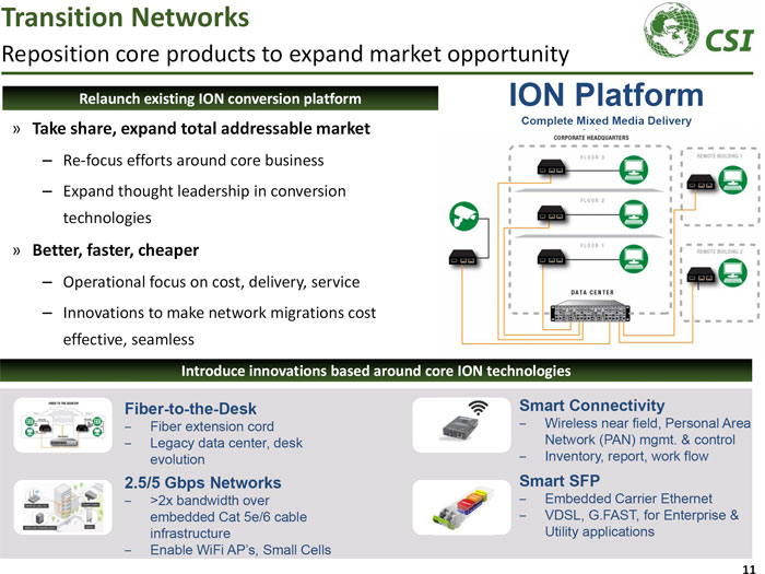 Infrastructure and Services for Global Communications NASDAQ: JCS 10 Transition Networks Participating in the Enterprise evolution to Fiber, Ethernet connectivity Large addressable market, attractive growth Current Serviceable Market Total Addressable Market Opportunity Total Copper Switch Ports Over 1.2 BILLION Copper Switch Ports in Service Solutions for Enterprise networks evolution – Diversified customer base; Federal, Enterprise, Service Provider, Industrial – Established Tier 1 channels