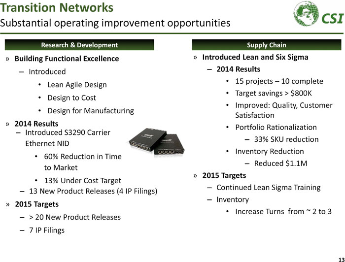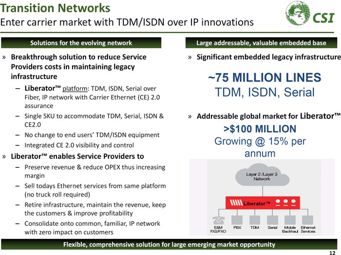 Infrastructure and Services for Global Communications NASDAQ: JCS 12 Transition Networks Enter carrier market with TDM/ISDN over IP innovations Large addressable, valuable embedded baseSolutions for the evolving network ~75 MILLION LINES TDM, ISDN, Serial » Significant embedded legacy infrastructure » Addressable global market for Liberator™ >$100 MILLION Growing @ 15% per annum Flexible, comprehensive solution for large emerging market opportunity Liberator™