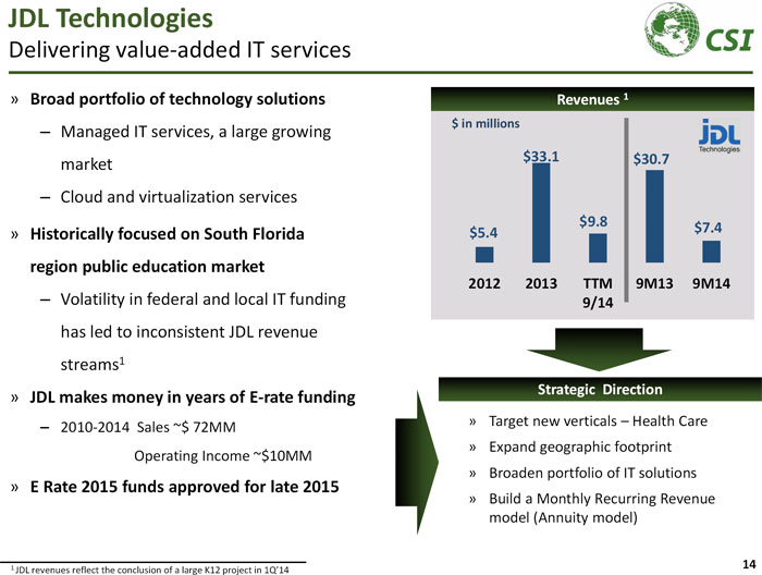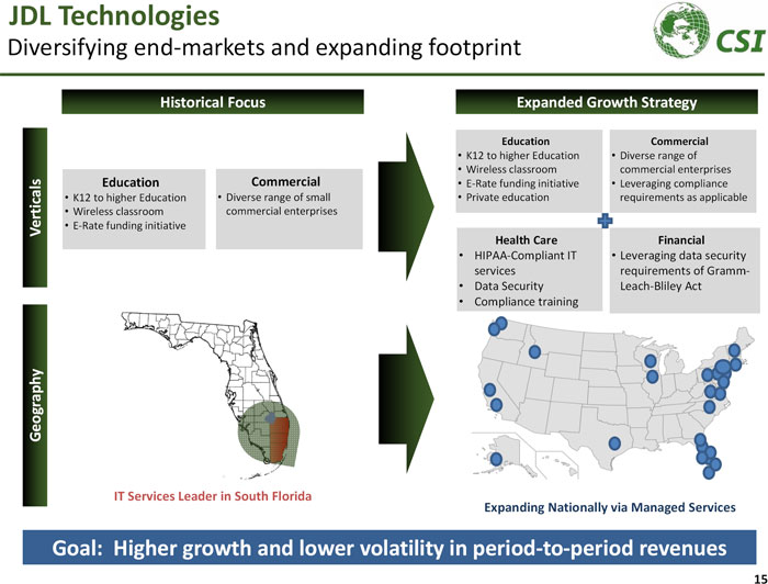 Infrastructure and Services for Global Communications NASDAQ: JCS 14 JDL Technologies Delivering value-added IT services » Broad portfolio of technology solutions – Managed IT services, a large growing market – Cloud and virtualization services » Historically focused on South Florida region public education market – Volatility in federal and local IT funding has led to inconsistent JDL revenue streams 1 » JDL makes money in years of E-rate funding – 2010-2014 Sales ~$ 72MM Operating Income ~$10MM » E Rate 2015 funds approved for late 2015 Revenues 1 $ in millions » Target new verticals –Health Care » Expand geographic footprint » Broaden portfolio of IT solutions » Build a Monthly Recurring Revenue model (Annuity model) Strategic Direction 1 JDL revenues reflect the conclusion of a large K12 project in 1Q’14