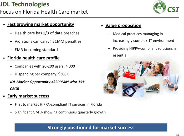 Infrastructure and Services for Global Communications NASDAQ: JCS 15 JDL Technologies Diversifying end-markets and expanding footprint Historical Focus Expanded Growth Strategy Verticals Geography Health Care •HIPAA-Compliant IT services •Data Security •Compliance training Financial •Leveraging data security requirements of Gramm- Leach-Bliley Act Goal: Higher growth and lower volatility in period-to-period revenues Education •K12 to higher Education •Wireless classroom •E-Rate funding initiative Commercial •Diverse range of small commercial enterprises Education •K12 to higher Education •Wireless classroom •E-Rate funding initiative •Private education IT Services Leader in South Florida Expanding Nationally via Managed Services Commercial •Diverse range of commercial enterprises •Leveraging compliance requirements as applicable