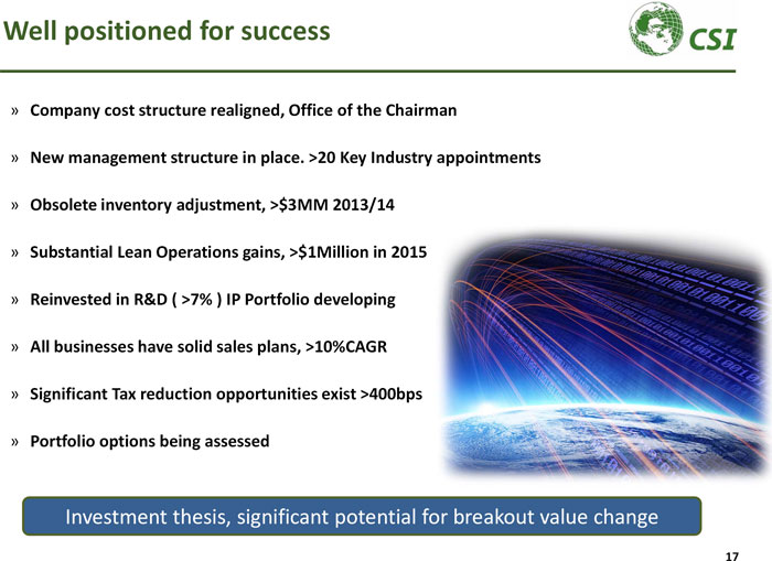 Infrastructure and Services for Global Communications NASDAQ: JCS 16 JDL Technologies Focus on Florida Health Care market »Fast growing market opportunity – Health care has 1/3 of data breaches – Violations can carry >$1MM penalties – EMR becoming standard »Value proposition – Medical practices managing in increasingly complex IT environment – Providing HIPPA-compliant solutions is essential »Florida health care profile – Companies with 20-200 users: 4,000 – IT spending per company: $300K JDL Market Opportunity >$200MM with 15% CAGR »Early market success – First to market HIPPA-compliant IT services in Florida – Significant GM % showing continuous quarterly growth Strongly positioned for market success