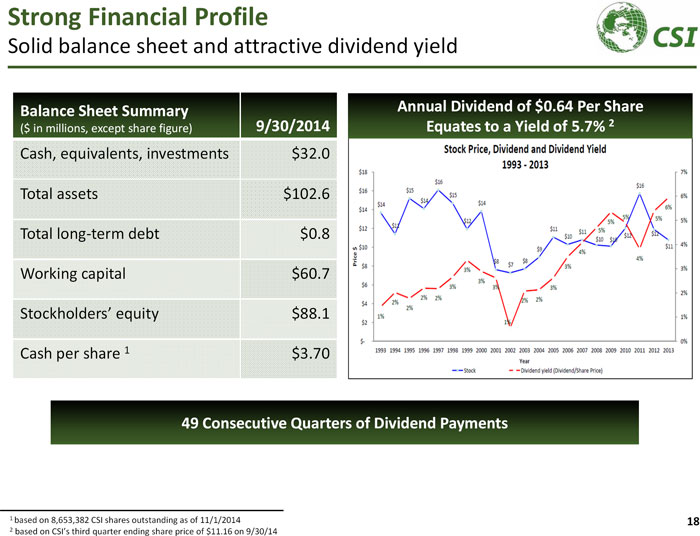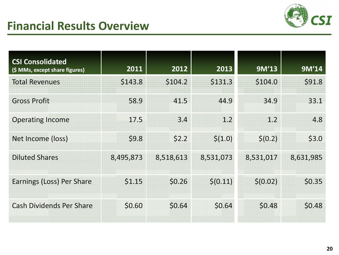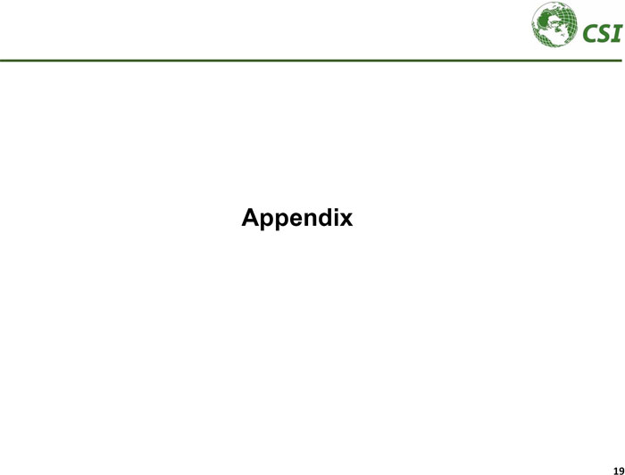 Infrastructure and Services for Global Communications NASDAQ: JCS 18 Strong Financial Profile Solid balance sheet and attractive dividend yield 1 based on 8,653,382 CSI shares outstanding as of 11/1/2014 2 based on CSI’s third quarter ending share price of $11.16 on 9/30/14 Balance Sheet Summary ($ in millions, except share figure) 9/30/2014 Cash, equivalents, investments $32.0 Total assets $102.6 Total long-term debt $0.8 Working capital $60.7 Stockholders’equity $88.1 Cash per share 1 $3.70 Annual Dividend of $0.64 Per Share Equates to a Yield of 5.7% 2 49 Consecutive Quarters of Dividend Payments
