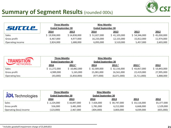 Infrastructure and Services for Global Communications NASDAQ: JCS 20 Financial Results Overview CSI Consolidated ($ MMs, except share figures) 2011 2012 2013 9M‘13 9M‘14 Total Revenues $143.8 $104.2 $131.3 $104.0 $91.8 Gross Profit 58.9 41.5 44.9 34.9 33.1 Operating Income 17.5 3.4 1.2 1.2 4.8 Net Income (loss) $9.8 $2.2 $(1.0) $(0.2) $3.0 Diluted Shares 8,495,873 8,518,613 8,531,073 8,531,017 8,631,985 Earnings (Loss) Per Share $1.15 $0.26 $(0.11) $(0.02) $0.35 Cash Dividends Per Share $0.60 $0.64 $0.64 $0.48 $0.48