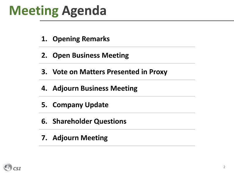 Meeting Agenda 2 1. Opening Remarks 2. Open Business Meeting 3. Vote on Matters Presented in Proxy 4. Adjourn Business Meeting 5. Company Update 6. Shareholder Questions 7. Adjourn Meeting