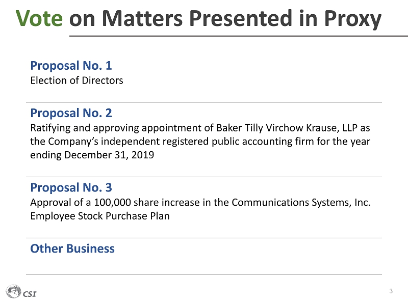 Vote on Matters Presented in Proxy 3 Proposal No. 1 Election of Directors Proposal No. 2 Ratifying and approving appointment of Baker Tilly Virchow Krause, LLP as the Company’s independent registered public accounting firm for the year ending December 31, 2019 Proposal No. 3 Approval of a 100,000 share increase in the Communications Systems, Inc. Employee Stock Purchase Plan Other Business
