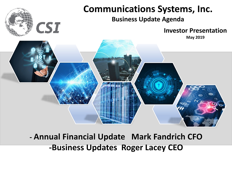 Investor Presentation May 2019 Communications Systems, Inc. Business Update Agenda - Annual Financial Update Mark Fandrich CFO - Business Updates Roger Lacey CEO