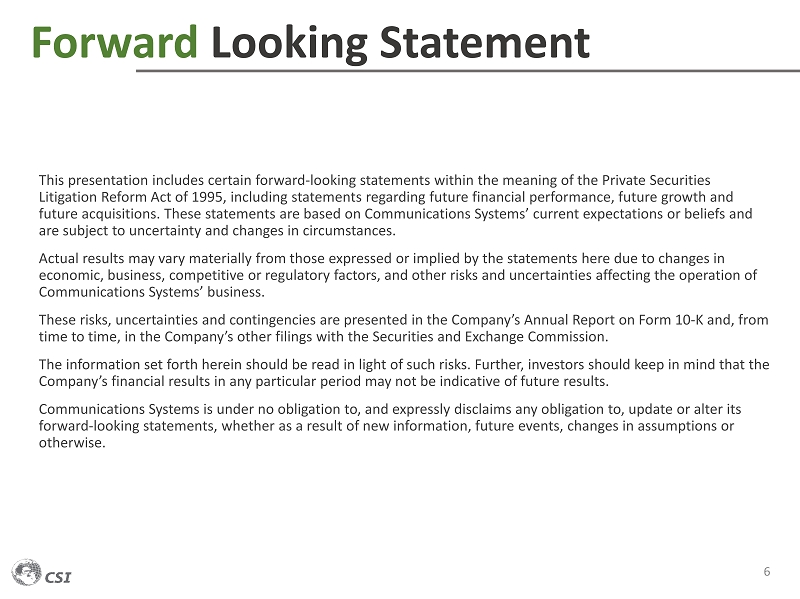 Forward Looking Statement This presentation includes certain forward - looking statements within the meaning of the Private Securities Litigation Reform Act of 1995, including statements regarding future financial performance, future growth and future acquisitions. These statements are based on Communications Systems’ current expectations or beliefs and are subject to uncertainty and changes in circumstances. Actual results may vary materially from those expressed or implied by the statements here due to changes in economic, business, competitive or regulatory factors, and other risks and uncertainties affecting the operation of Communications Systems’ business. These risks, uncertainties and contingencies are presented in the Company’s Annual Report on Form 10 - K and, from time to time, in the Company’s other filings with the Securities and Exchange Commission. The information set forth herein should be read in light of such risks. Further, investors should keep in mind that the Company’s financial results in any particular period may not be indicative of future results. Communications Systems is under no obligation to, and expressly disclaims any obligation to, update or alter its forward - looking statements, whether as a result of new information, future events, changes in assumptions or otherwise. 6