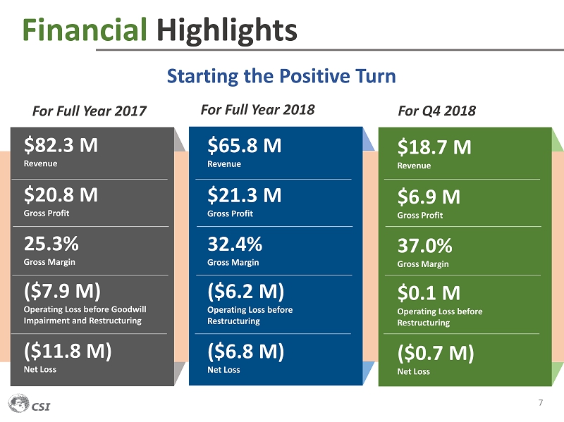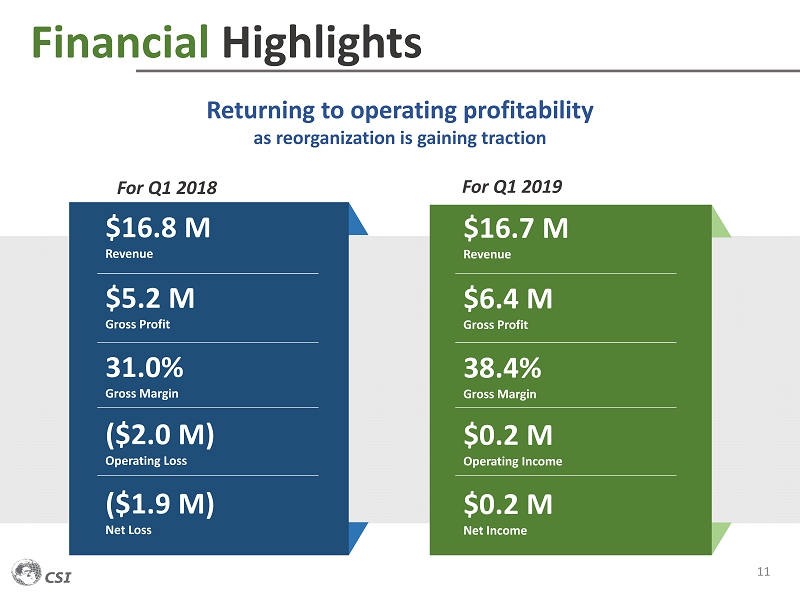 Financial Highlights 9 $1.4 M ($7.5 M) $0.7 M ($2.4 M) For Full Year 2017 Operating Income (Loss ) (before Goodwill Impairment and Restructuring) For Full Year 2018 $1.9 M ($4.7 M) ($0.6 M) ($2.8 M) $1.1 M ($1.0 M) $0.6 M ($0.6 M) For Q4 2018 ($7.9 M) CSI Consolidated ($6.2 M) CSI Consolidated $0.1 M CSI Consolidated