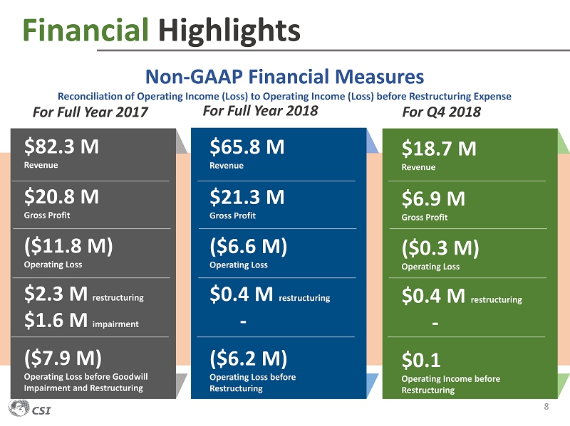 Financial Highlights 7 $82.3 M Revenue $20.8 M Gross Profit 25.3% Gross Margin ($7.9 M) Operating Loss before Goodwill Impairment and Restructuring ($11.8 M) Net Loss For Full Year 2017 Starting the Positive Turn For Full Year 2018 $ 65.8 M Revenue $21.3 M Gross Profit 32.4% Gross Margin ($6.2 M) Operating Loss before Restructuring ($6.8 M) Net Loss $18.7 M Revenue $6.9 M Gross Profit 37.0% Gross Margin $0.1 M Operating Loss before Restructuring ($0.7 M) Net Loss For Q4 2018