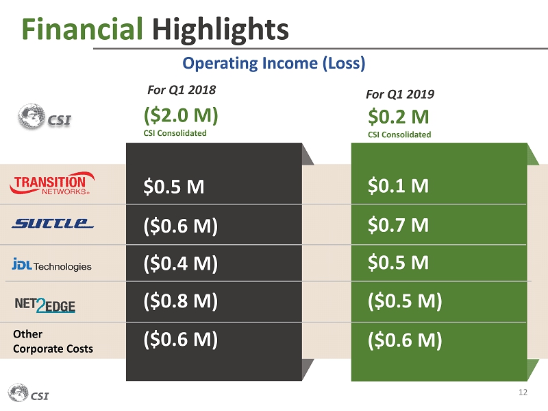 Financial Highlights 11 $16.8 M Revenue $5.2 M Gross Profit 31.0% Gross Margin ($2.0 M) Operating Loss ($1.9 M) Net Loss For Q1 2018 Returning to operating profitability as reorganization is gaining traction For Q1 2019 $16.7 M Revenue $6.4 M Gross Profit 38.4% Gross Margin $0.2 M Operating Income $0.2 M Net Income