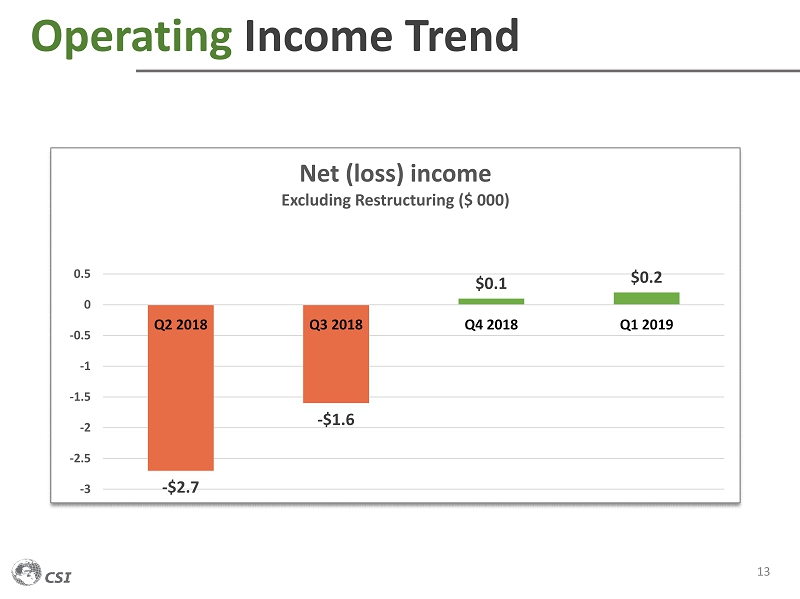 Financial Highlights 12 $0.5 M ($0.6 M) ($0.4 M) ($0.8 M) ($0.6 M) For Q1 2018 Operating Income (Loss) For Q1 2019 $0.1 M $0.7 M $0.5 M ($0.5 M) ($0.6 M) ($2.0 M) CSI Consolidated $0.2 M CSI Consolidated Other Corporate Costs