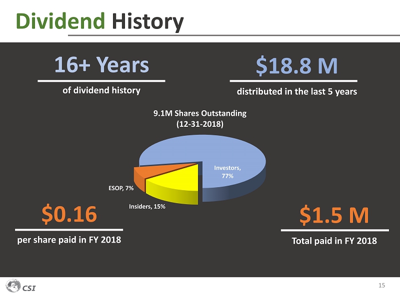 Financial Highlights 14 As of 12 - 31 - 2018 Balance Sheet Continues to be Strong As of 03 - 31 - 2018 $11.1 M Cash & Cash Equivalents $30.7 M Working Capital $0 Debt $41.7 M Shareholders’ Equity $9.5 M Cash & Cash Equivalents $31.2 M Working Capital $0 Debt $42.1 M Shareholders’ Equity +$5M FutureLink (sold in April 2019) +$10M Headquarters (possible sale) Other