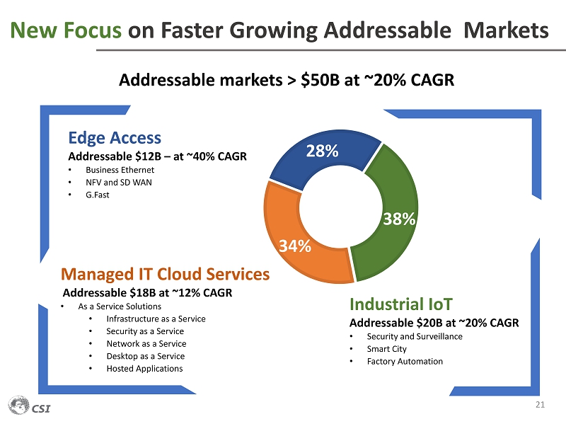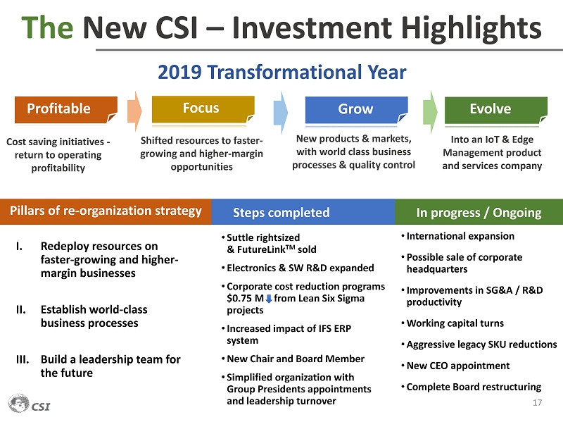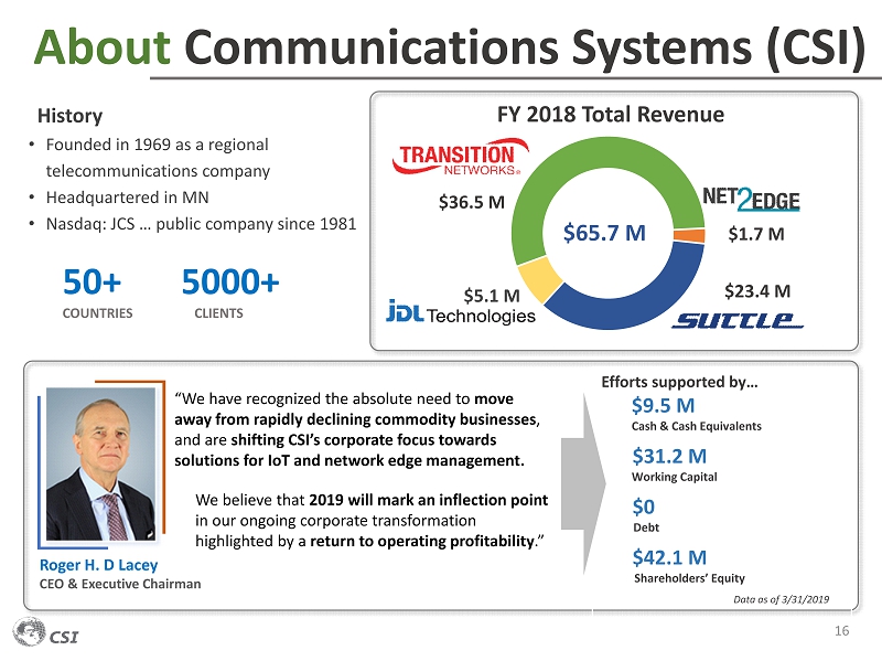 $36.5 M $1.7 M $23.4 M $5.1 M FY 2018 Total Revenue About Communications Systems (CSI) History • Founded in 1969 as a regional telecommunications company • Headquartered in MN • Nasdaq: JCS … public company since 1981 16 50+ COUNTRIES 5000+ CLIENTS “We have recognized the absolute need to move away from rapidly declining commodity businesses , and are shifting CSI’s corporate focus towards solutions for IoT and network edge management. Roger H. D Lacey CEO & Executive Chairman Efforts supported by… $9.5 M Cash & Cash Equivalents $31.2 M Working Capital $0 Debt $42.1 M Shareholders’ Equity Data as of 3/31/2019 We believe that 2019 will mark an inflection point in our ongoing corporate transformation highlighted by a return to operating profitability .” $65.7 M