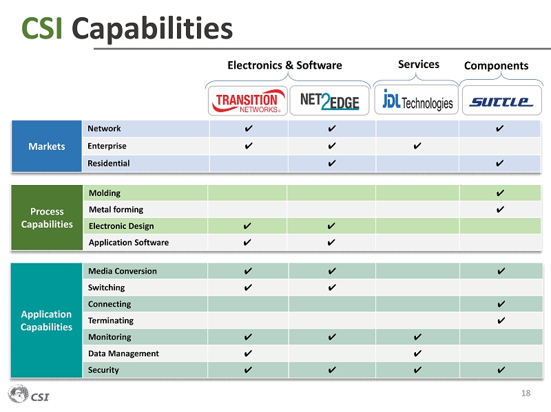 The New CSI – Investment Highlights 17 I. Redeploy resources on faster - growing and higher - margin businesses II. Establish world - class business processes III. Build a leadership team for the future Pillars of re - organization strategy Steps completed In progress / Ongoing Cost saving initiatives - return to operating profitability Profitable Shifted resources to faster - growing and higher - margin opportunities Into an IoT & Edge Management product and services company New products & markets, with world class business processes & quality control Focus Grow 2019 Transformational Year • Suttle rightsized & FutureLink TM sold • Electronics & SW R&D expanded • Corporate cost reduction programs $0.75 M from Lean Six Sigma projects • Increased impact of IFS ERP system • New Chair and Board Member • Simplified organization with Group Presidents appointments and leadership turnover • International expansion • Possible sale of corporate headquarters • Improvements in SG&A / R&D productivity • Working capital turns • Aggressive legacy SKU reductions • New CEO appointment • Complete Board restructuring Evolve