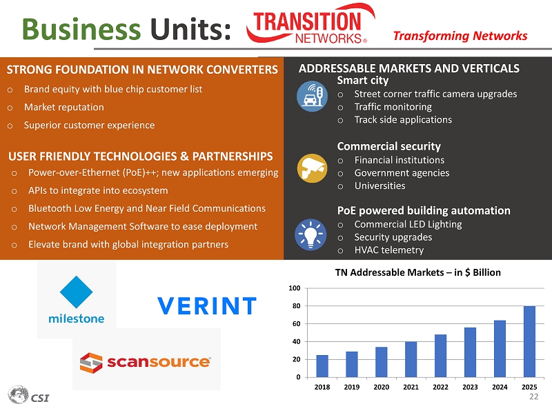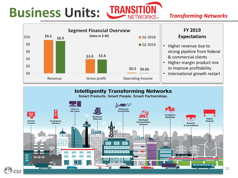 Business Units: 22 STRONG FOUNDATION IN NETWORK CONVERTERS o Brand equity with blue chip customer list o Market reputation o Superior customer experience o Power - over - Ethernet (PoE)++; new applications emerging o APIs to integrate into ecosystem o Bluetooth Low Energy and Near Field Communications o Network Management Software to ease deployment o Elevate brand with global integration partners USER FRIENDLY TECHNOLOGIES & PARTNERSHIPS Transforming Networks ADDRESSABLE MARKETS AND VERTICALS Smart city o Street corner traffic camera upgrades o Traffic monitoring o Track side applications Commercial security o Financial institutions o Government agencies o Universities PoE powered building automation o Commercial LED Lighting o Security upgrades o HVAC telemetry 0 20 40 60 80 100 2018 2019 2020 2021 2022 2023 2024 2025 TN Addressable Markets – in $ Billion