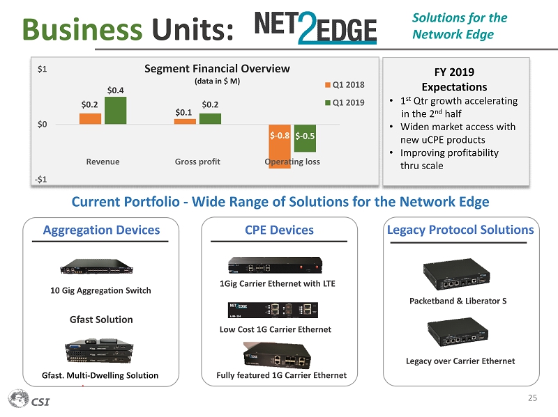 Business Units: 23 Transforming Networks FY 2019 Expectations • Higher revenue due to strong pipeline from federal & commercial clients • Higher - margin product mix to improve profitability • International growth restart $9.2 $3.9 $0.5 $8.9 $3.8 $0.06 $0 $2 $4 $6 $8 $10 Revenue Gross profit Operating income Segment Financial Overview (data in $ M) Q1 2018 Q1 2019