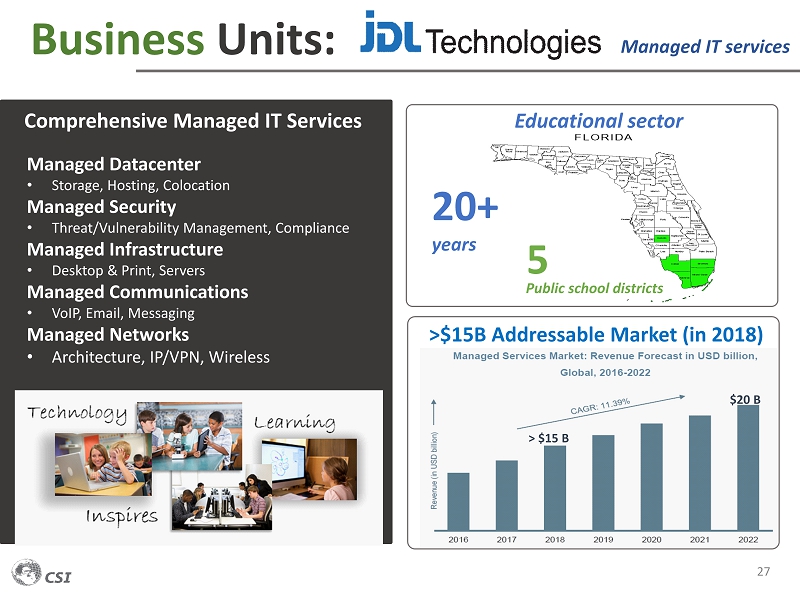Business Units: 27 > $15 B $20 B Managed Datacenter • Storage, Hosting, Colocation Managed Security • Threat/Vulnerability Management, Compliance Managed Infrastructure • Desktop & Print, Servers Managed Communications • VoIP, Email, Messaging Managed Networks • Architecture, IP/VPN, Wireless Managed IT services >$15B Addressable Market (in 2018) Comprehensive Managed IT Services 20+ years 5 Public school districts Educational sector