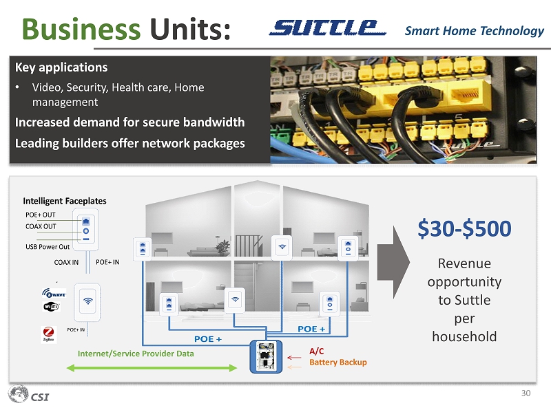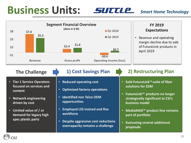 Business Units: 29 Smart Home Technology 1) Cost Savings Plan • Tier 1 Service Operators focused on services and content • Network engineering driven by cost • Limited value of / or demand for legacy high spec plastic parts • Sold FutureLink™ suite of fiber solutions for $5M • FutureLink™ products no longer strategically significant to CSI’s business model • MediaMAX™ product line remains part of portfolio • Evaluating several additional proposals • Reduced operating cost • Optimized factory operations • Identified non Telco OEM opportunities • Employed LSS trained and flex workforce • Despite aggressive cost reductions overcapacity remains a challenge 2) Restructuring Plan $7.0 $ 1.4 - $ 0.6 $5.5 $ 1.8 $ 0.7 -$1 $2 $5 $8 Revenue Gross profit Operating income (loss) Segment Financial Overview (data in $ M) Q1 2018 Q1 2019 FY 2019 Expectations • Revenue and operating margin decline due to sale of FutureLink products in April 2019 The Challenge