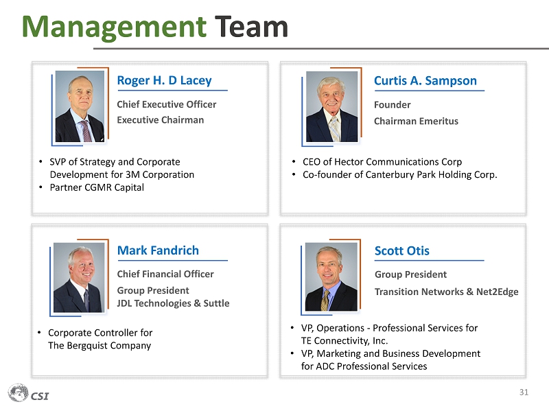 Management Team 31 Roger H. D Lacey Chief Executive Officer Executive Chairman • SVP of Strategy and Corporate Development for 3M Corporation • Partner CGMR Capital Mark Fandrich Chief Financial Officer Group President JDL Technologies & Suttle • Corporate Controller for The Bergquist Company Curtis A. Sampson Founder Chairman Emeritus • CEO of Hector Communications Corp • Co - founder of Canterbury Park Holding Corp. Scott Otis Group President Transition Networks & Net2Edge • VP, Operations - Professional Services for TE Connectivity, Inc. • VP, Marketing and Business Development for ADC Professional Services