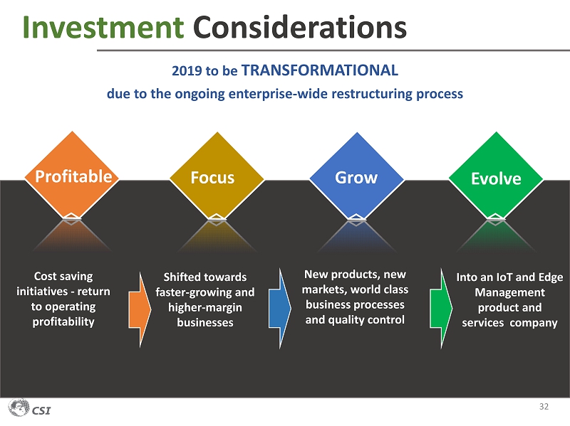 Investment Considerations 2019 to be TRANSFORMATIONAL due to the ongoing enterprise - wide restructuring process 32 Cost saving initiatives - return to operating profitability Shifted towards faster - growing and higher - margin businesses Into an IoT and Edge Management product and services company New products, new markets, world class business processes and quality control Profitable Focus Grow Evolve