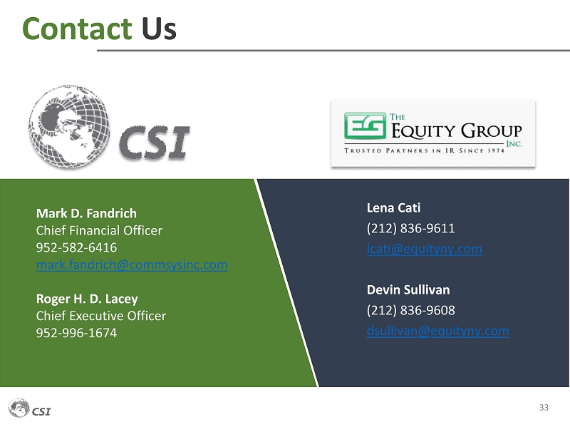 Contact Us 33 Lena Cati (212) 836 - 9611 lcati@equityny.com Devin Sullivan (212) 836 - 9608 dsullivan@equityny.com Mark D. Fandrich Chief Financial Officer 952 - 582 - 6416 mark.fandrich@commsysinc.com Roger H. D. Lacey Chief Executive Officer 952 - 996 - 1674
