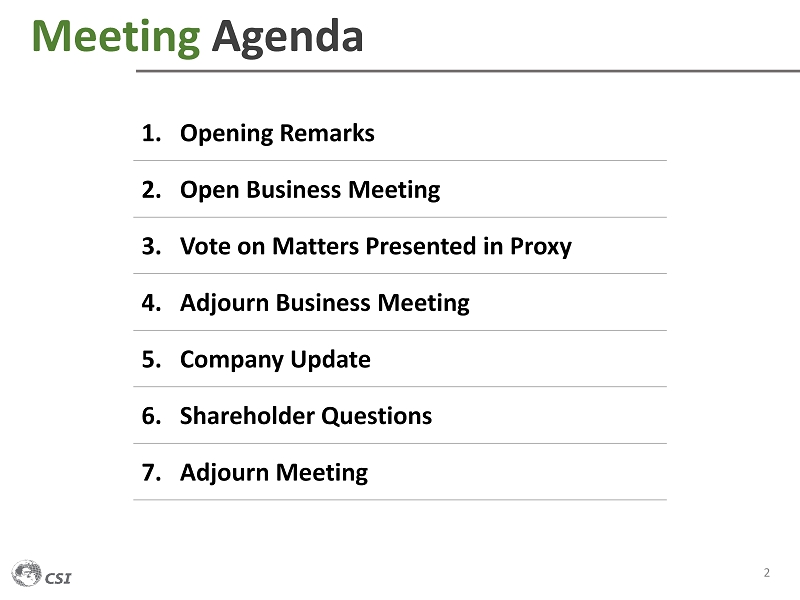 Meeting Agenda 2 1. Opening Remarks 2. Open Business Meeting 3. Vote on Matters Presented in Proxy 4. Adjourn Business Meeting 5. Company Update 6. Shareholder Questions 7. Adjourn Meeting