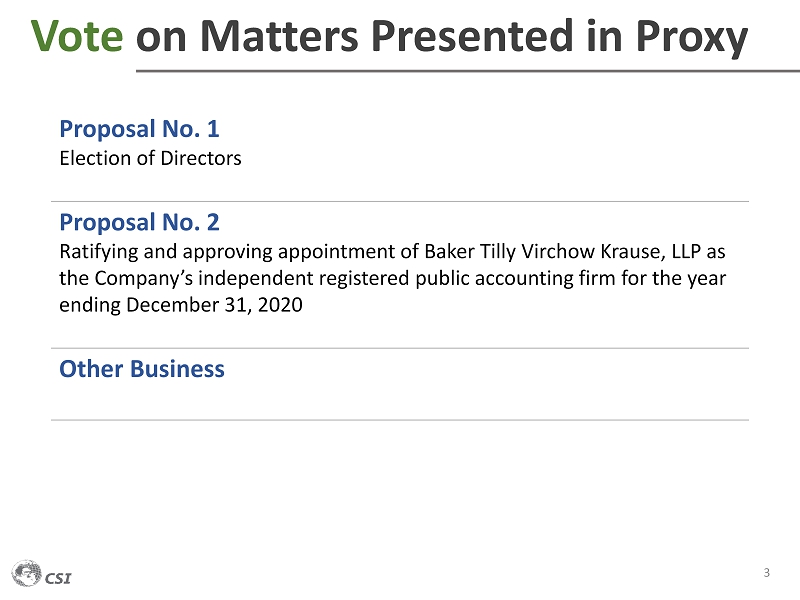 Vote on Matters Presented in Proxy 3 Proposal No. 1 Election of Directors Proposal No. 2 Ratifying and approving appointment of Baker Tilly Virchow Krause, LLP as the Company’s independent registered public accounting firm for the year ending December 31, 2020 Other Business