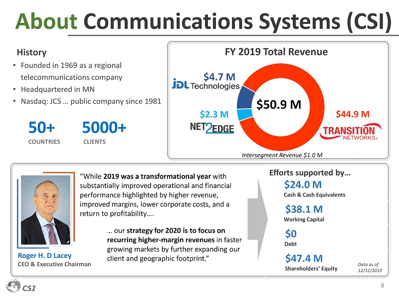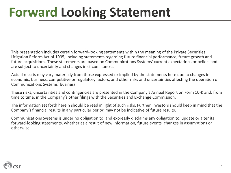 Forward Looking Statement This presentation includes certain forward - looking statements within the meaning of the Private Securities Litigation Reform Act of 1995, including statements regarding future financial performance, future growth and future acquisitions. These statements are based on Communications Systems’ current expectations or beliefs and are subject to uncertainty and changes in circumstances. Actual results may vary materially from those expressed or implied by the statements here due to changes in economic, business, competitive or regulatory factors, and other risks and uncertainties affecting the operation of Communications Systems’ business. These risks, uncertainties and contingencies are presented in the Company’s Annual Report on Form 10 - K and, from time to time, in the Company’s other filings with the Securities and Exchange Commission. The information set forth herein should be read in light of such risks. Further, investors should keep in mind that the Company’s financial results in any particular period may not be indicative of future results. Communications Systems is under no obligation to, and expressly disclaims any obligation to, update or alter its forward - looking statements, whether as a result of new information, future events, changes in assumptions or otherwise. 7