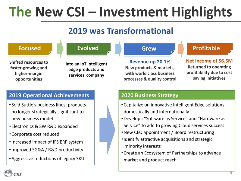 $44.9 M $2.3 M FY 2019 Total Revenue About Communications Systems (CSI) History • Founded in 1969 as a regional telecommunications company • Headquartered in MN • Nasdaq: JCS … public company since 1981 8 50+ COUNTRIES 5000+ CLIENTS “While 2019 was a transformational year with substantially improved operational and financial performance highlighted by higher revenue, improved margins, lower corporate costs, and a return to profitability…. Roger H. D Lacey CEO & Executive Chairman Efforts supported by… $24.0 M Cash & Cash Equivalents $38.1 M Working Capital $0 Debt $47.4 M Shareholders’ Equity … our strategy for 2020 is to focus on recurring higher - margin revenues in faster growing markets by further expanding our client and geographic footprint.” $50.9 M $4.7 M Data as of 12/31/2019 Intersegment Revenue $1.0 M