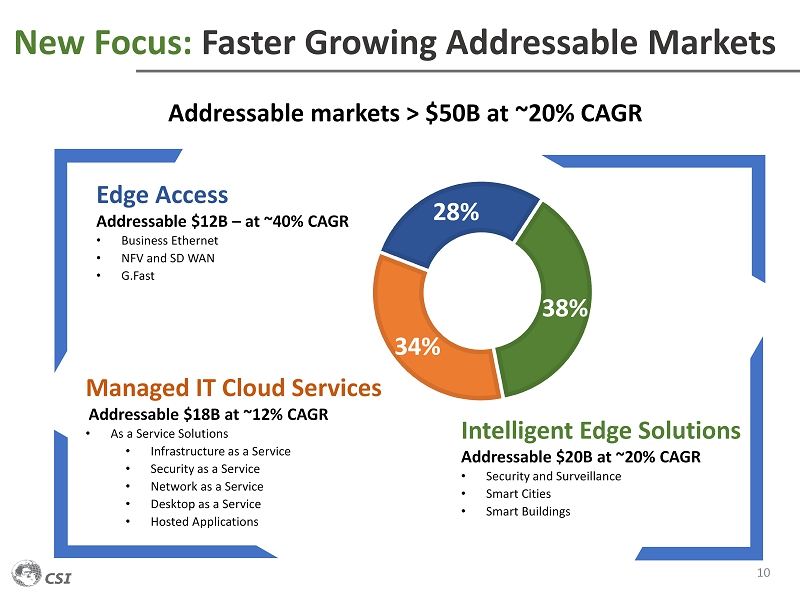 The New CSI – Investment Highlights 9 Profitable Shifted resources to faster - growing and higher - margin opportunities Into an IoT intelligent edge products and services company Focused Grew 2019 was Transformational Evolved 2019 Operational Achievements • Sold Suttle’s business lines: products no longer strategically significant to new business model • Electronics & SW R&D expanded • Corporate cost reduced • Increased impact of IFS ERP system • Improved SG&A / R&D productivity • Aggressive reductions of legacy SKU 2020 Business Strategy • Capitalize on innovative Intelligent Edge solutions domestically and internationally • Develop : “Software as Service” and “Hardware as Service” to add to growing Cloud services success • New CEO appointment / Board restructuring • Identify attractive acquisitions and strategic minority interests • Create an Ecosystem of Partnerships to advance market and product reach Revenue up 20.1% New products & markets, with world class business processes & quality control Net income of $6.5M Returned to operating profitability due to cost saving initiatives