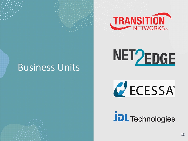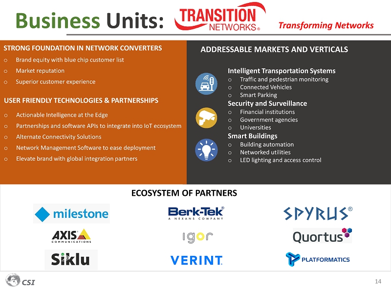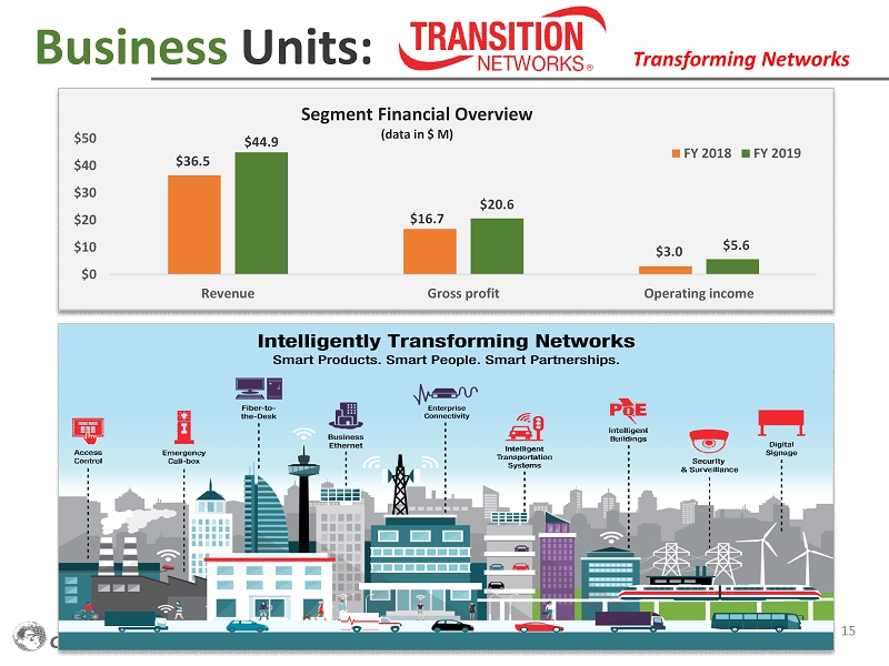 Business Units: 14 Transforming Networks ECOSYSTEM OF PARTNERS STRONG FOUNDATION IN NETWORK CONVERTERS o Brand equity with blue chip customer list o Market reputation o Superior customer experience o Actionable Intelligence at the Edge o Partnerships and software APIs to integrate into IoT ecosystem o Alternate Connectivity Solutions o Network Management Software to ease deployment o Elevate brand with global integration partners USER FRIENDLY TECHNOLOGIES & PARTNERSHIPS ADDRESSABLE MARKETS AND VERTICALS Intelligent Transportation Systems o Traffic and pedestrian monitoring o Connected Vehicles o Smart Parking Security and Surveillance o Financial institutions o Government agencies o Universities Smart Buildings o Building automation o Networked utilities o LED lighting and access control