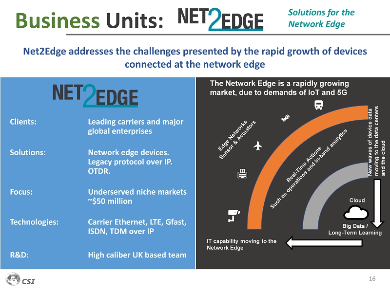 Business Units: 16 Clients: Leading carriers and major global enterprises Solutions: Network edge devices. Legacy protocol over IP. OTDR. Focus: Underserved niche markets ~$50 million Technologies: Carrier Ethernet, LTE, Gfast, ISDN, TDM over IP R&D: High caliber UK based team Net2Edge addresses the challenges presented by the rapid growth of devices connected at the network edge Solutions for the Network Edge Cloud IT capability moving to the Network Edge New waves of device data moving to the data centers and the cloud Big Data / Long - Term Learning The Network Edge is a rapidly growing market, due to demands of IoT and 5G
