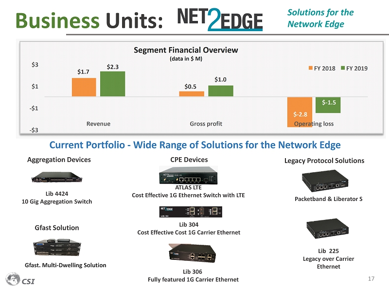 Business Units: 17 Current Portfolio - Wide Range of Solutions for the Network Edge Lib 304 Cost Effective Cost 1G Carrier Ethernet ATLAS LTE Cost Effective 1G Ethernet Switch with LTE Lib 4424 10 Gig Aggregation Switch Lib 225 Legacy over Carrier Ethernet Gfast . Multi - Dwelling Solution Packetband & Liberator S Solutions for the Network Edge Aggregation Devices CPE Devices Legacy Protocol Solutions Lib 306 Fully featured 1G Carrier Ethernet Gfast Solution