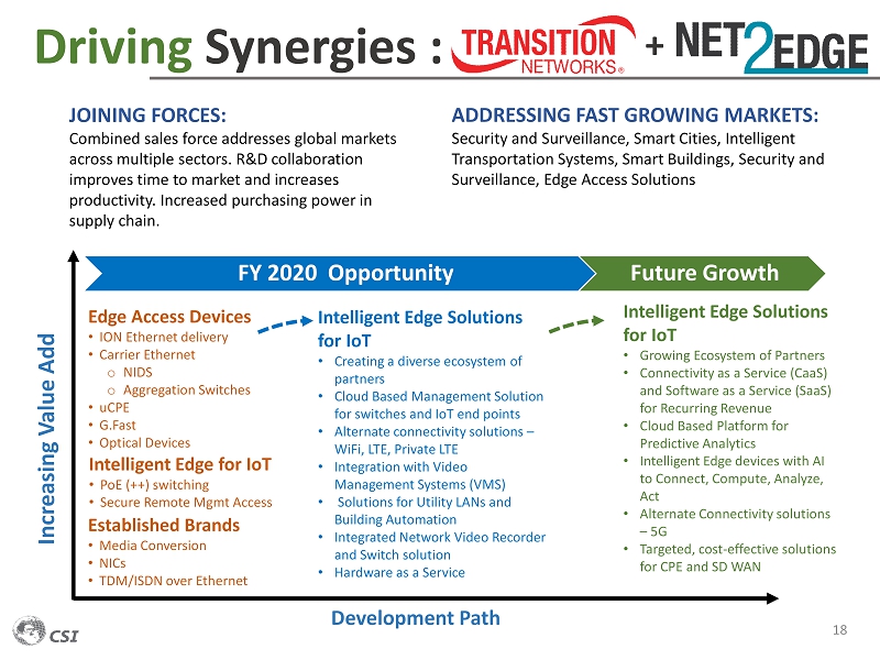 Edge Access Devices • ION Ethernet delivery • Carrier Ethernet o NIDS o Aggregation Switches • uCPE • G.Fast • Optical Devices Driving Synergies : 18 Packetband & Liberator S Development Path Increasing Value Add Established Brands • Media Conversion • NICs • TDM/ISDN over Ethernet Intelligent Edge Solutions for IoT • Creating a diverse ecosystem of partners • Cloud Based Management Solution for switches and IoT end points • Alternate connectivity solutions – WiFi , LTE, Private LTE • Integration with Video Management Systems (VMS) • Solutions for Utility LANs and Building Automation • Integrated Network Video Recorder and Switch solution • Hardware as a Service Intelligent Edge Solutions for IoT • Growing Ecosystem of Partners • Connectivity as a Service (CaaS) and Software as a Service (SaaS) for Recurring Revenue • Cloud Based Platform for Predictive Analytics • Intelligent Edge devices with AI to Connect, Compute, Analyze, Act • Alternate Connectivity solutions – 5G • Targeted, cost - effective solutions for CPE and SD WAN FY 2020 Opportunity Future Growth JOINING FORCES : Combined sales force addresses global markets across multiple sectors. R&D collaboration improves time to market and increases productivity. Increased purchasing power in supply chain. ADDRESSING FAST GROWING MARKETS : Security and Surveillance, Smart Cities, Intelligent Transportation Systems, Smart Buildings, Security and Surveillance, Edge Access Solutions + Intelligent Edge for IoT • PoE (++) switching • Secure Remote Mgmt Access