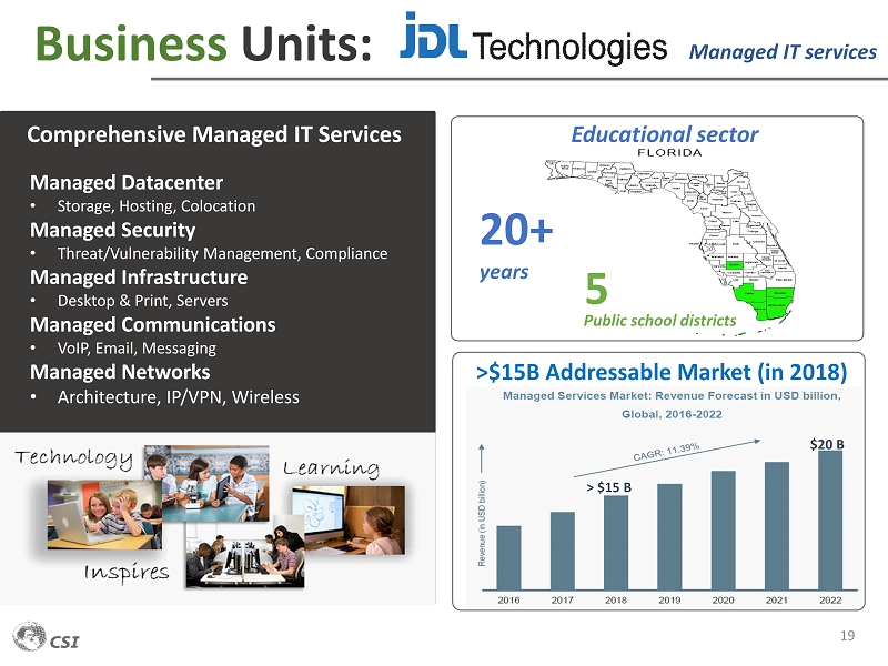Business Units: 19 > $15 B $20 B Managed Datacenter • Storage, Hosting, Colocation Managed Security • Threat/Vulnerability Management, Compliance Managed Infrastructure • Desktop & Print, Servers Managed Communications • VoIP, Email, Messaging Managed Networks • Architecture, IP/VPN, Wireless Managed IT services >$15B Addressable Market (in 2018) Comprehensive Managed IT Services 20+ years 5 Public school districts Educational sector