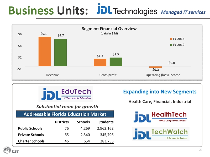 Business Units: 20 Addressable Florida Education Market Districts Schools Students Public Schools 76 4,269 2,962,162 Private Schools 65 2,540 345,796 Charter Schools 46 654 283,755 Substantial room for growth $5.1 $1.3 - $0.3 $4.7 $1.5 - $0.0 -$1 $2 $4 $6 Revenue Gross profit Operating (loss) income Segment Financial Overview (data in $ M) FY 2018 FY 2019 Managed IT services Expanding into New Segments Health Care, Financial, Industrial