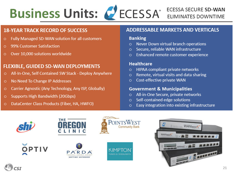 Business Units: 21 18 - YEAR TRACK RECORD OF SUCCESS o Fully Managed SD - WAN solution for all customers o 99% Customer Satisfaction o Over 10,000 solutions worldwide o All - In - One, Self Contained SW Stack - Deploy Anywhere o No Need To Change IP Addresses o Carrier Agnostic (Any Technology, Any ISP, Globally) o Supports High Bandwidth (20Gbps) o DataCenter Class Products (Fiber, HA, HWFO) FLEXIBLE, GUIDED SD - WAN DEPLOYMENTS ECESSA SECURE SD - WAN ELIMINATES DOWNTIME ADDRESSABLE MARKETS AND VERTICALS Banking o Never Down virtual branch operations o Secure, reliable WAN infrastructure o Enhanced remote customer experience Healthcare o HIPAA compliant private networks o Remote, virtual visits and data sharing o Cost - effective private WAN Government & Municipalities o All - in - One Secure, private networks o Self - contained edge solutions o Easy integration into existing infrastructure