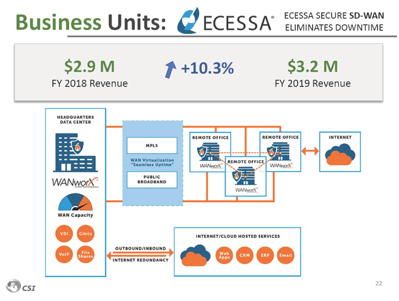 Business Units: 22 ECESSA SECURE SD - WAN ELIMINATES DOWNTIME $2.9 M FY 2018 Revenue $3.2 M FY 2019 Revenue +10.3%