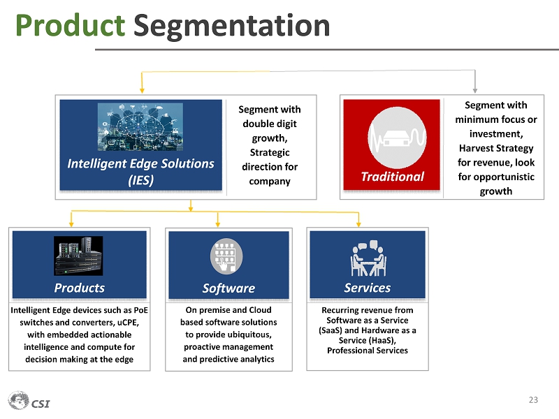 Product Segmentation Intelligent Edge devices such as PoE switches and converters, uCPE , with embedded actionable intelligence and compute for decision making at the edge Products On premise and Cloud based software solutions to provide ubiquitous, proactive management and predictive analytics Software Recurring revenue from Software as a Service (SaaS) and Hardware as a Service ( HaaS ), Professional Services Services Segment with double digit growth, Strategic direction for company Intelligent Edge Solutions (IES) Segment with minimum focus or investment, Harvest Strategy for revenue, look for opportunistic growth Traditional 23