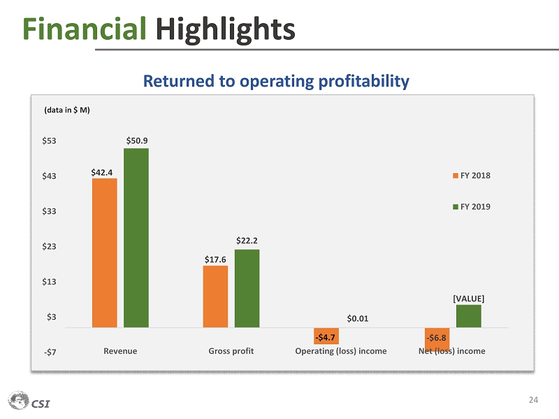 24 $42.4 $17.6 - $4.7 - $6.8 $50.9 $22.2 $0.01 [VALUE] -$7 $3 $13 $23 $33 $43 $53 Revenue Gross profit Operating (loss) income Net (loss) income (data in $ M) FY 2018 FY 2019 Returned to operating profitability Financial Highlights