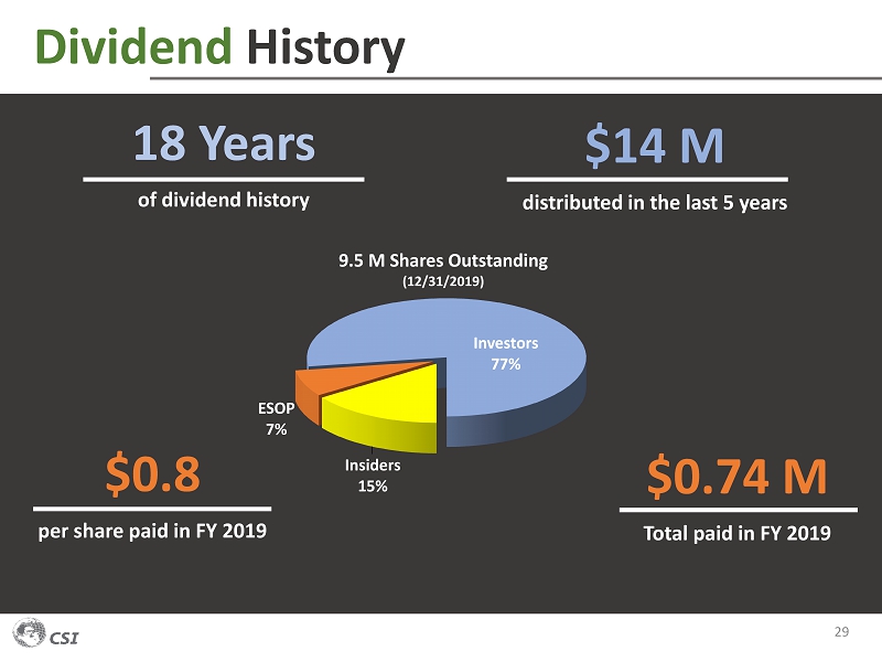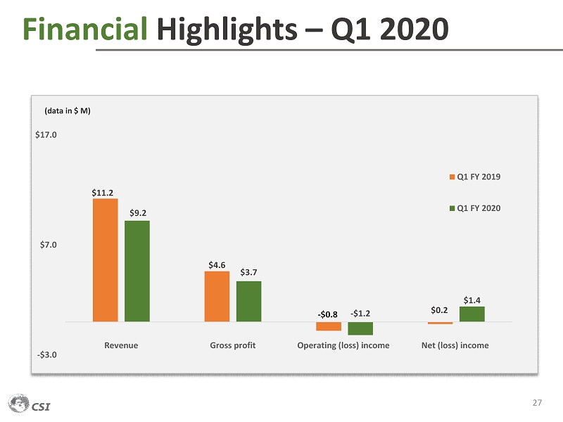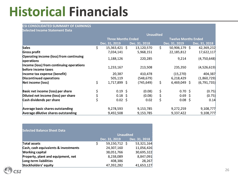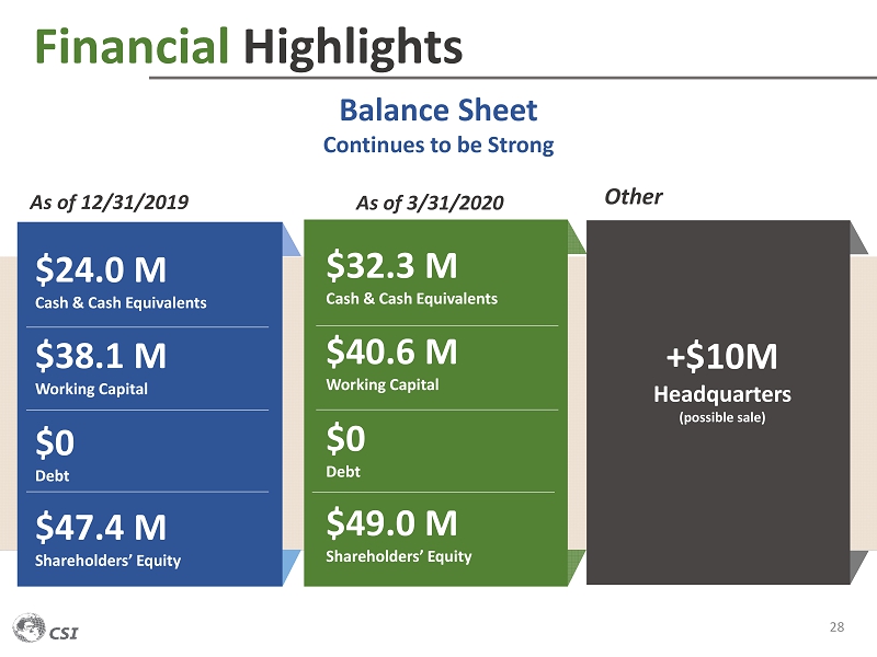 Historical Financials 26 CSI CONSOLIDATED SUMMARY OF EARNINGS Selected Income Statement Data Unaudited Three Months Ended Twelve Months Ended Dec. 31, 2019 Dec. 31, 2018 Dec. 31, 2019 Dec. 31, 2018 Sales $ 15,363,421 $ 13,120,570 $ 50,906,179 $ 42,369,232 Gross profit 7,034,141 5,968,151 22,185,812 17,622,117 Operating income (loss) from continuing operations 1,188,126 220,285 9,214 (4,750,648) Income (loss) from continuing operations before income taxes 1,233,167 213,508 235,350 (4,526,619) Income tax expense (benefit) 20,387 410,478 (15,270) 404,387 Discontinued operations 505,119 (548,679) 6,218,429 (1,860,729) Net income (loss) $ 1,717,899 $ (745,649) $ 6,469,049 $ (6,791,735) Basic net income (loss) per share $ 0.19 $ (0.08) $ 0.70 $ (0.75) Diluted net income (loss) per share $ 0.18 $ (0.08) $ 0.69 $ (0.75) Cash dividends per share $ 0.02 $ 0.02 $ 0.08 $ 0.14 Average basic shares outstanding 9,278,593 9,153,785 9,272,259 9,108,777 Average dilutive shares outstanding 9,492,508 9,153,785 9,337,422 9,108,777 Selected Balance Sheet Data Unaudited Dec. 31, 2019 Dec. 31, 2018 Total assets $ 59,150,712 $ 53,321,164 Cash, cash equivalents & investments 24,307,160 11,056,426 Working capital 38,051,766 30,695,322 Property, plant and equipment, net 8,238,089 8,847,091 Long - term liabilities 408,386 28,267 Stockholders’ equity 47,392,282 41,653,127