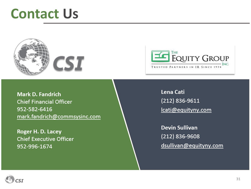 Contact Us 31 Lena Cati (212) 836 - 9611 lcati@equityny.com Devin Sullivan (212) 836 - 9608 dsullivan@equityny.com Mark D. Fandrich Chief Financial Officer 952 - 582 - 6416 mark.fandrich@commsysinc.com Roger H. D. Lacey Chief Executive Officer 952 - 996 - 1674